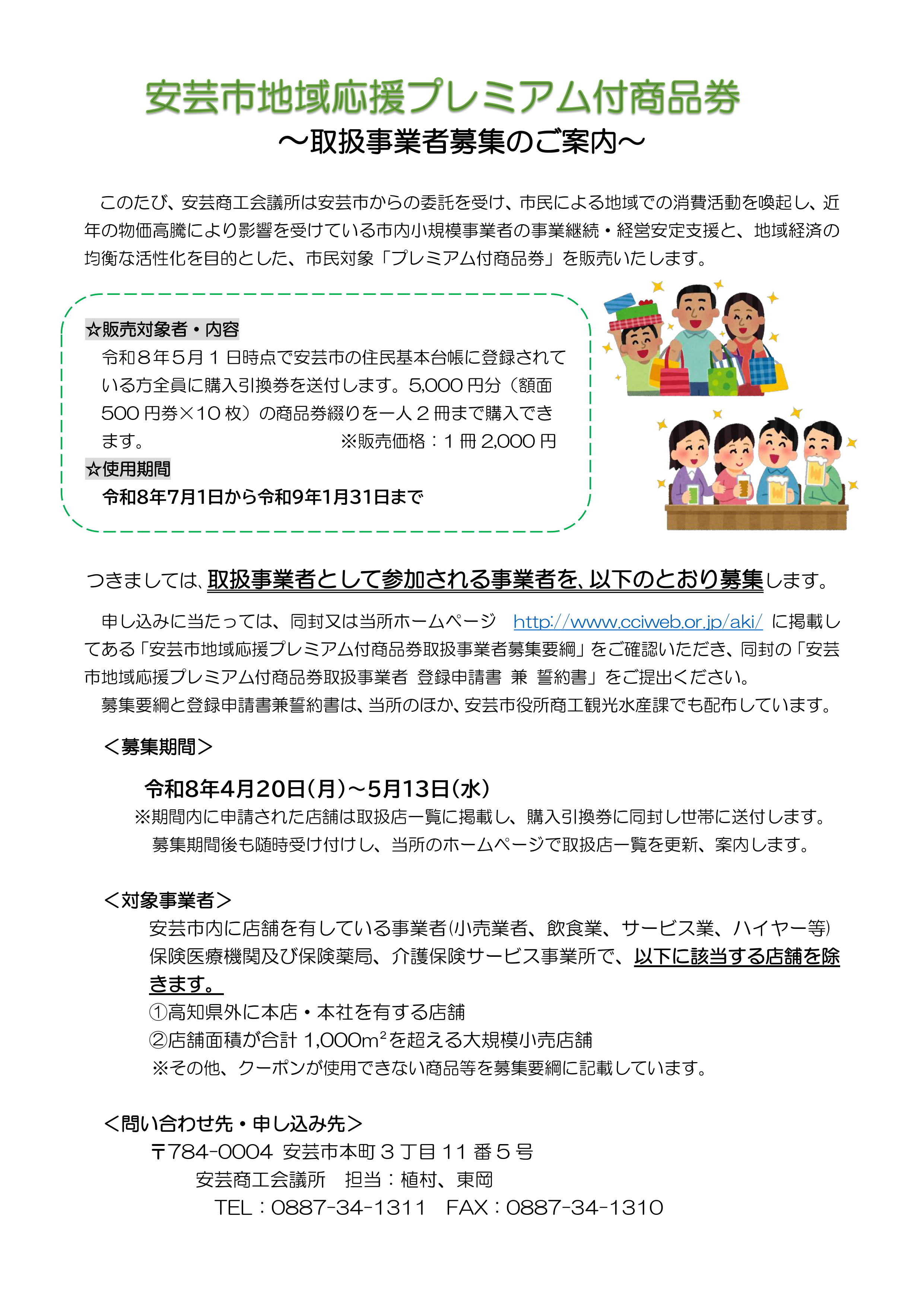 このたび、安芸商工会議所は安芸市からの委託を受け、市民による地域での消費活動を喚起し、近年の物価高騰により影響を受けている市内小規模事業者の事業継続・経営安定支援と、地域経済の均衡な活性化を目的とした、市民対象「プレミアム付商品券」を販売いたします。