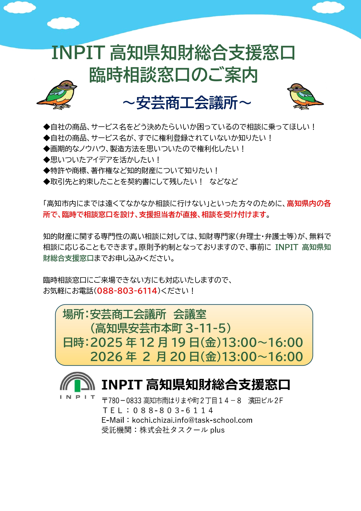 INPIT高知県知財総合支援窓口臨時相談窓口のご案内